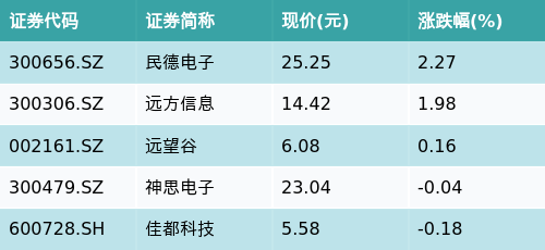 截至收盘,无人零售主题涨跌幅最高的五只股票为:民德电子(300656.SZ)、远方信息(300306.SZ)、远望谷(002161.SZ)、神思电子(300479.SZ)与佳都科技(600728.SH)。详情见下表: