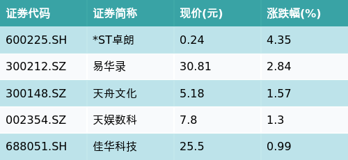 截至收盘,数据确权主题涨跌幅最高的五只股票为:*ST卓朗(600225.SH)、易华录(300212.SZ)、天舟文化(300148.SZ)、天娱数科(002354.SZ)与佳华科技(688051.SH)。详情见下表: