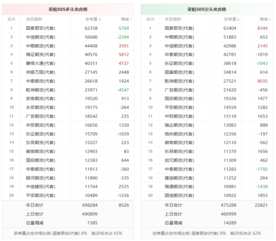 今日前20席多头持仓498284手,共占全市场65%,其中多头第一名国泰君安(代客)占全市场8%。
