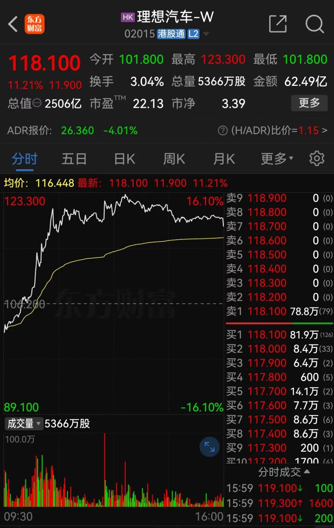 受上述消息影响,理想汽车在港股市场涨幅一度超16%。截至2月25日收盘,理想汽车港股股价报118.1港元/股,涨幅达11.21%,总市值为2506亿港元。