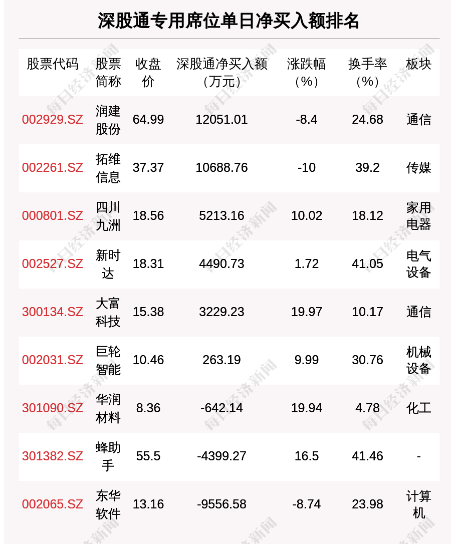在龙虎榜中,涉及深股通专用席位的个股有9只,润建股份的深股通专用席位净买入额最大,净买入1.21亿元。