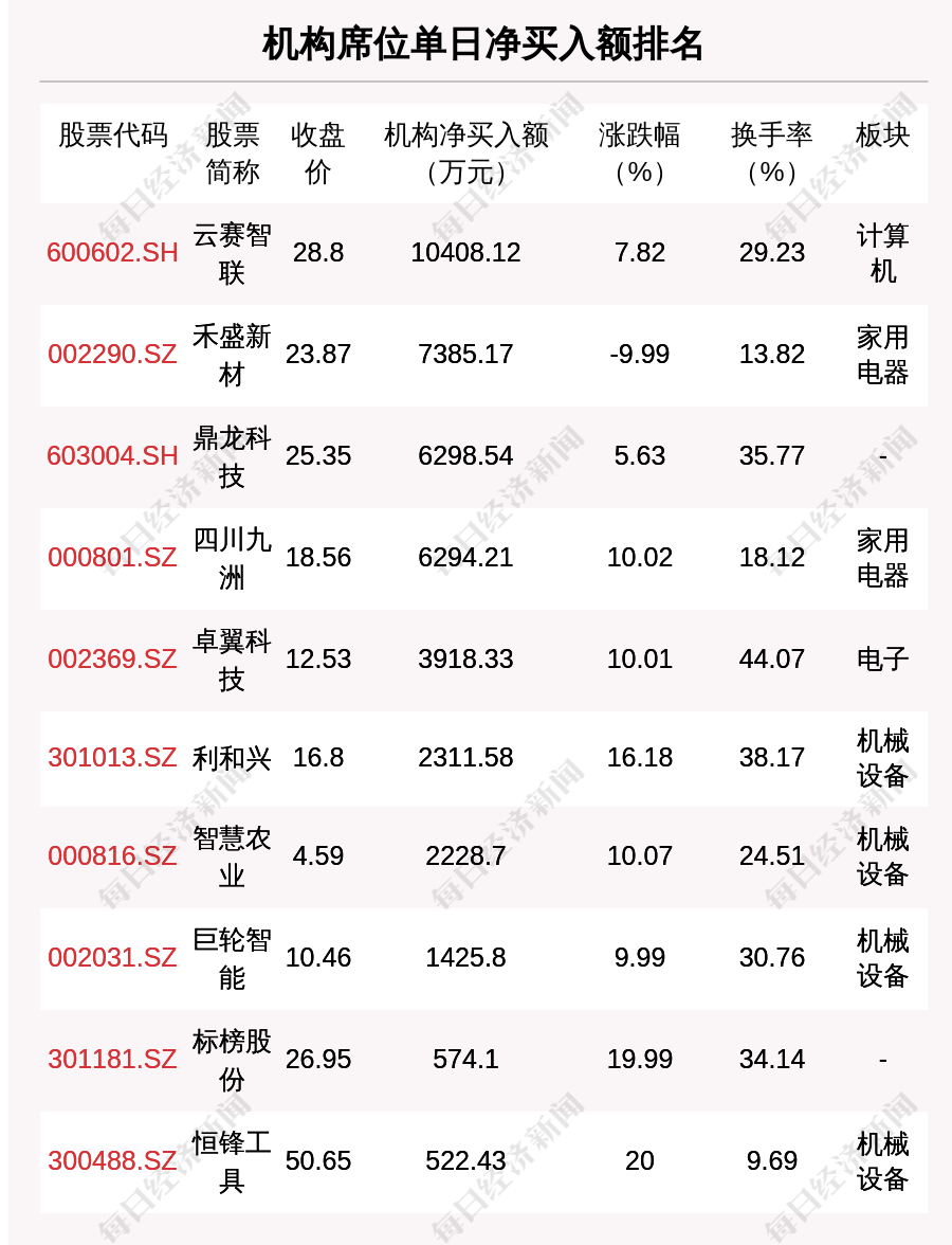 在龙虎榜中,涉及机构专用席位的个股有27只,净买入额前三的是云赛智联、禾盛新材、鼎龙科技,分别为1.04亿元、7385.17万元、6298.54万元。