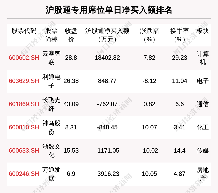 在龙虎榜中,涉及沪股通专用席位的个股有6只,云赛智联的沪股通专用席位净买入额最大,净买入1.84亿元。