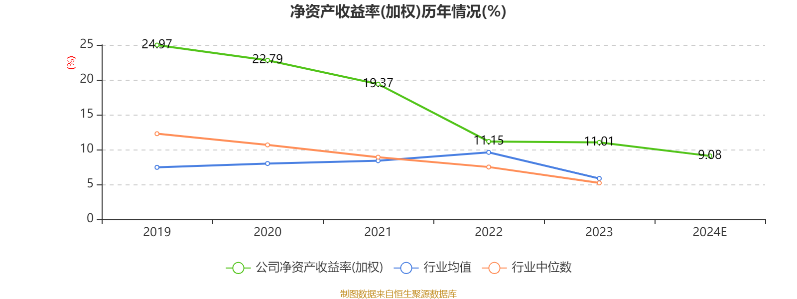 数据显示,2024年公司加权平均净资产收益率为9.08%,较上年同期下降1.93个百分点。