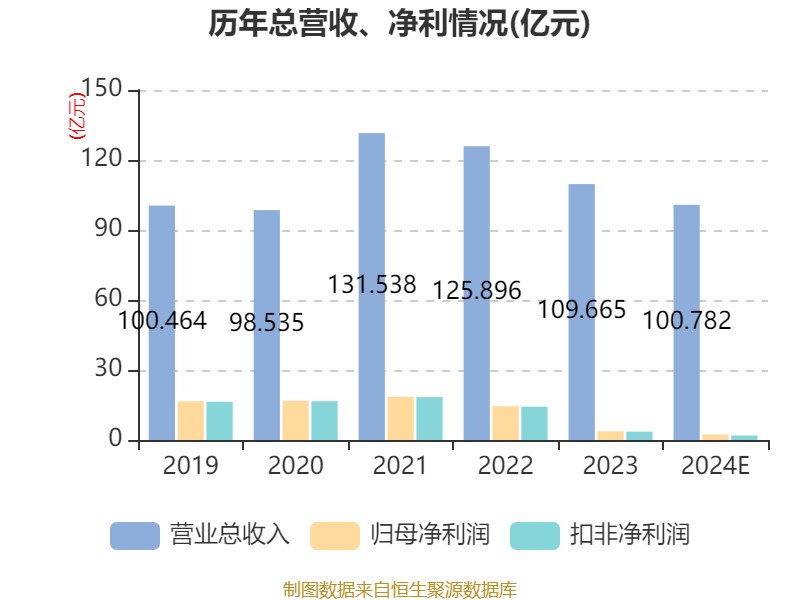 中证智能财讯北元集团(601568)2月25日晚间披露2024年业绩快报,公司实现营业收入100.78亿元,同比下降8.1%;归母净利润2.36亿元,同比下降36.77%;扣非净利润1.9亿元,同比下降46.86%;基本每股收益0.06元,加权平均净资产收益率为2.02%。以2月25日收盘价计算,北元集团目前市盈率(TTM)约为68.29倍,市净率(LF)约1.38倍,市销率(TTM)约1.59倍。