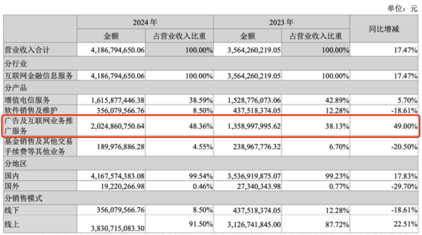 对于各业务板块的变化情况,同花顺在年报中表示,广告及互联网业务推广服务同比增长49.00%,主要是由于证券市场回暖,客户对广告及互联网业务推广需求提升,且公司产品与大模型技术深度融合,产品竞争力不断提高,平台活跃度上升,广告转化提升所致。