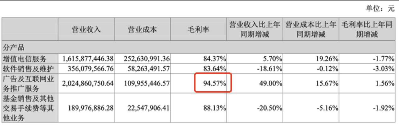 其中,广告及互联网业务推广服务的毛利率最高,达到94.57%,且该部分业务占营收比为48.36%,已接近一半。