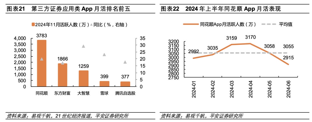 以2024年11月为例,当月同花顺APP月活人数达到3783万人,而同类型的第三方证券应用类APP东方财富、大智慧、雪球以及腾讯自选股在该月的月活人数分别为1866万人、1259万人、399万人和377万人。