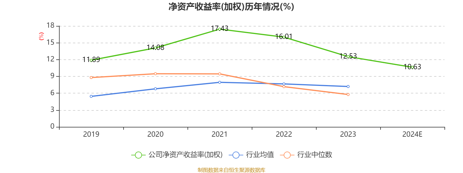 数据显示,2024年公司加权平均净资产收益率为10.63%,较上年同期下降1.9个百分点。