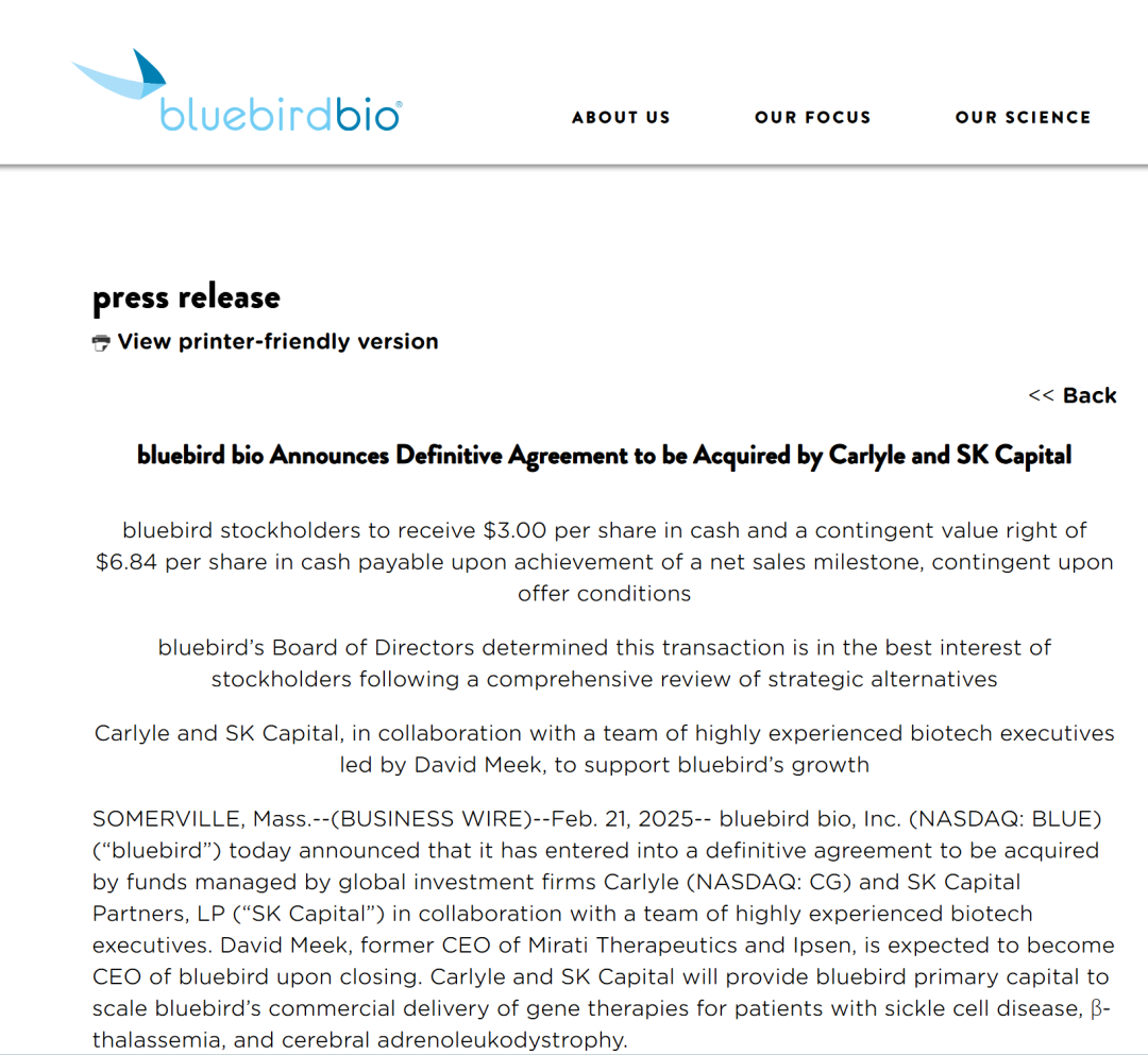 果不其然,蓝鸟生物在今年2月宣布“卖身”,但最高1亿美元的价格还是让市场为之震惊。收购方为全球两大投资巨头凯雷和SK Capital。根据协议,蓝鸟生物股东将获得每股3美元的现金,若公司现有疗法在2027年底前销售额达到6亿美元,公司股东还将获得每股6.84美元的额外支付。两项合计,此次交易的最高潜在金额约为1亿美元。