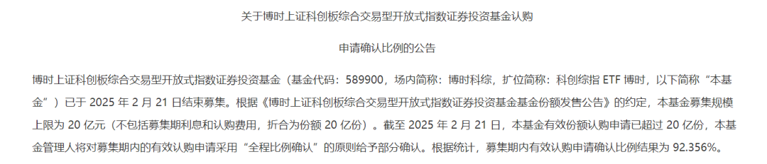 具体来看,建信科创综指ETF发行首日即售罄,有效认购申请确认比例为67.058%。此外,博时基金、易方达基金旗下科创综指ETF认购资金也均超过募集规模上限20亿元,启动比例配售。具体来看,博时科创综指ETF募集期内有效认购申请确认比例结果为92.356%,易方达科创综指ETF有效现金认购申请确认比例为96.39%。