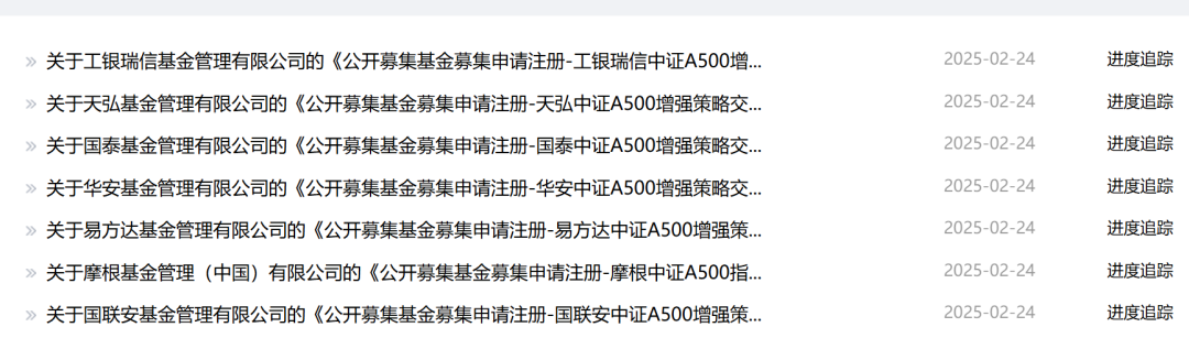 另有20多只权益类基金发布基金份额发售公告,敲定发行日期。与此同时,公募还在密集上报新的产品。中国证监会官网显示,2月24日,易方达基金、华安基金、国泰基金、天弘基金、工银瑞信基金、摩根基金、国联安基金集中上报了中证A500增强策略ETF。这也是首批上报的中证A500增强策略ETF。