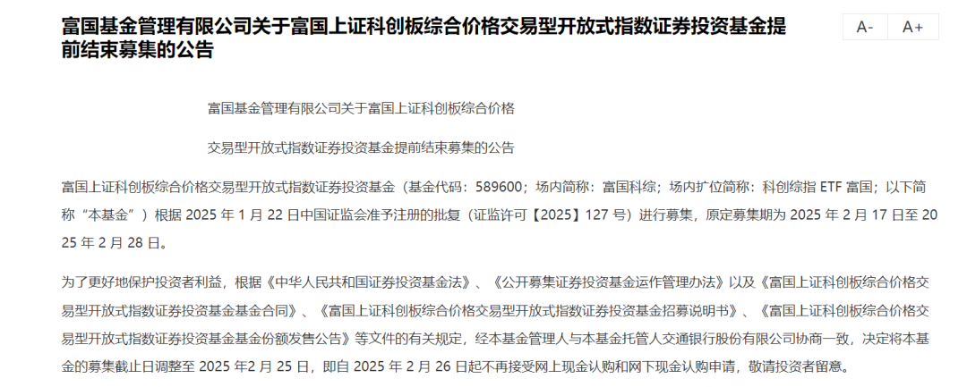 2月25日,富国基金公告称,富国科创综指ETF的募集截止日期由原定的2月28日调整至2月25日。至此,首批发行的13只科创综指ETF均已结束募集。