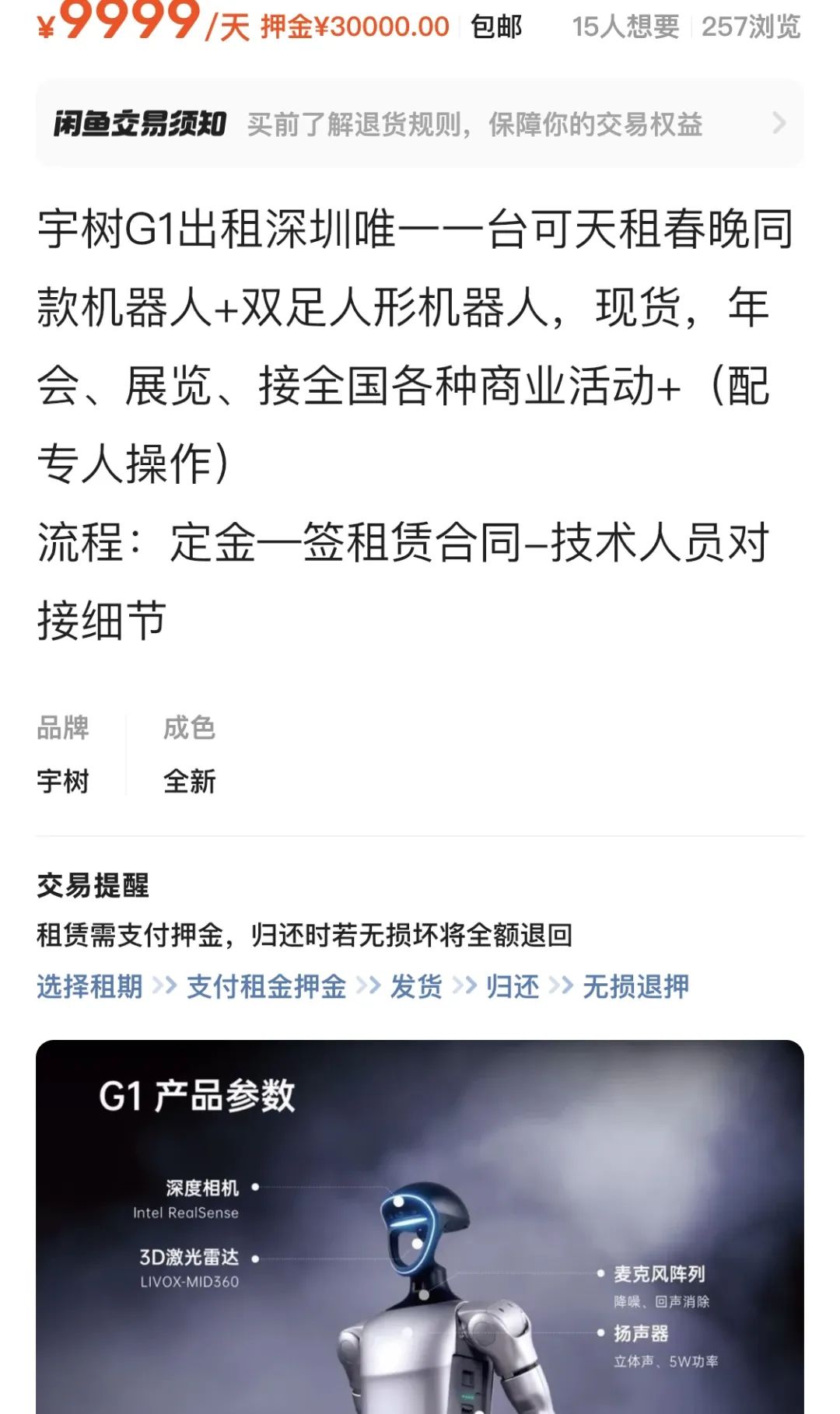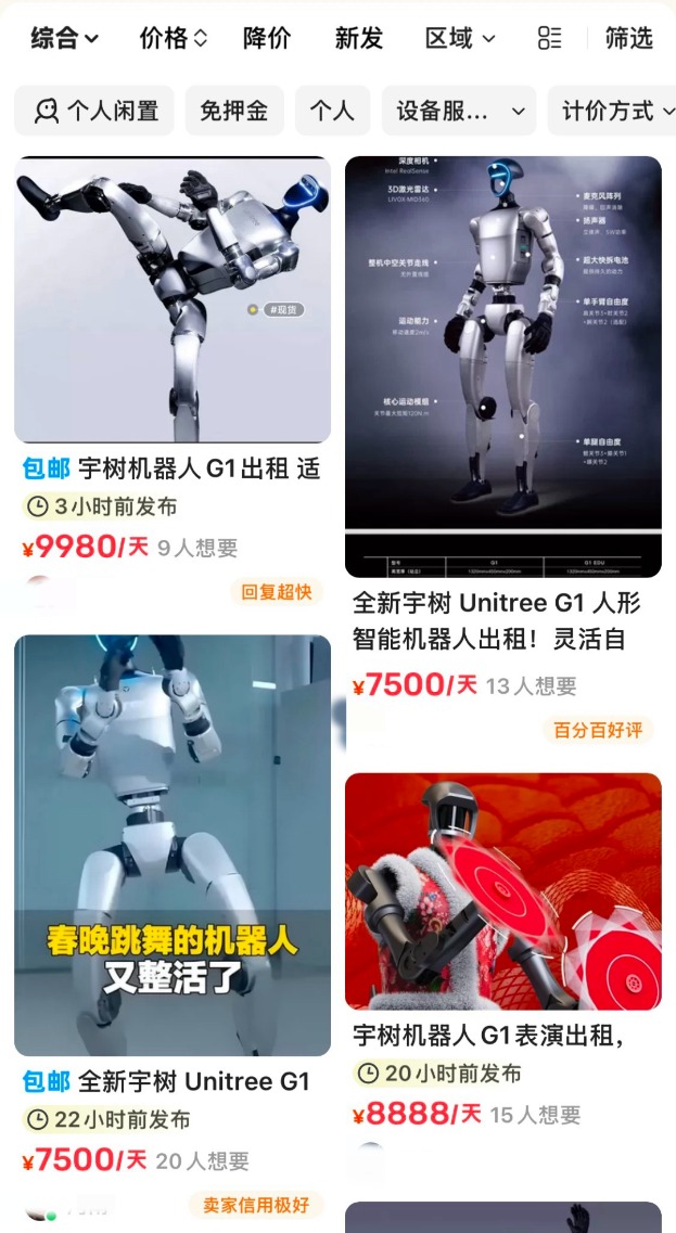 在二手租赁平台上,宇树G1机器人成为“抢手货”,单台日租金高达5000元至1.5万元,且需提前10天以上预订。