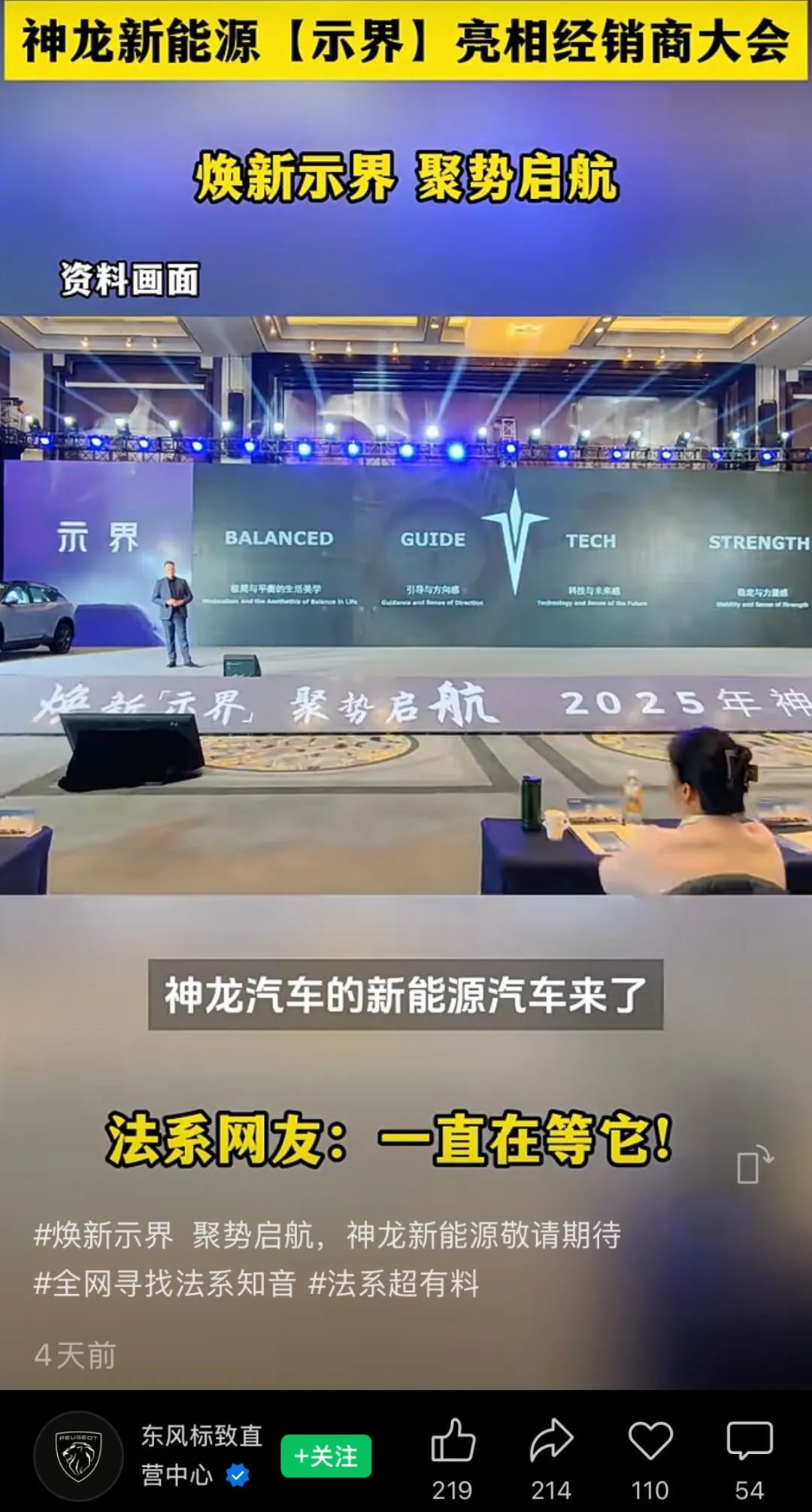 近日,一个名为“东风标致直营中心”的视频号发布内容显示,今年初的2025年神龙汽车经销商大会上,一款中文名为“示界”、英文名为“HEDMOS”的新车品牌亮相,配文显示这是神龙汽车旗下的新能源车品牌。