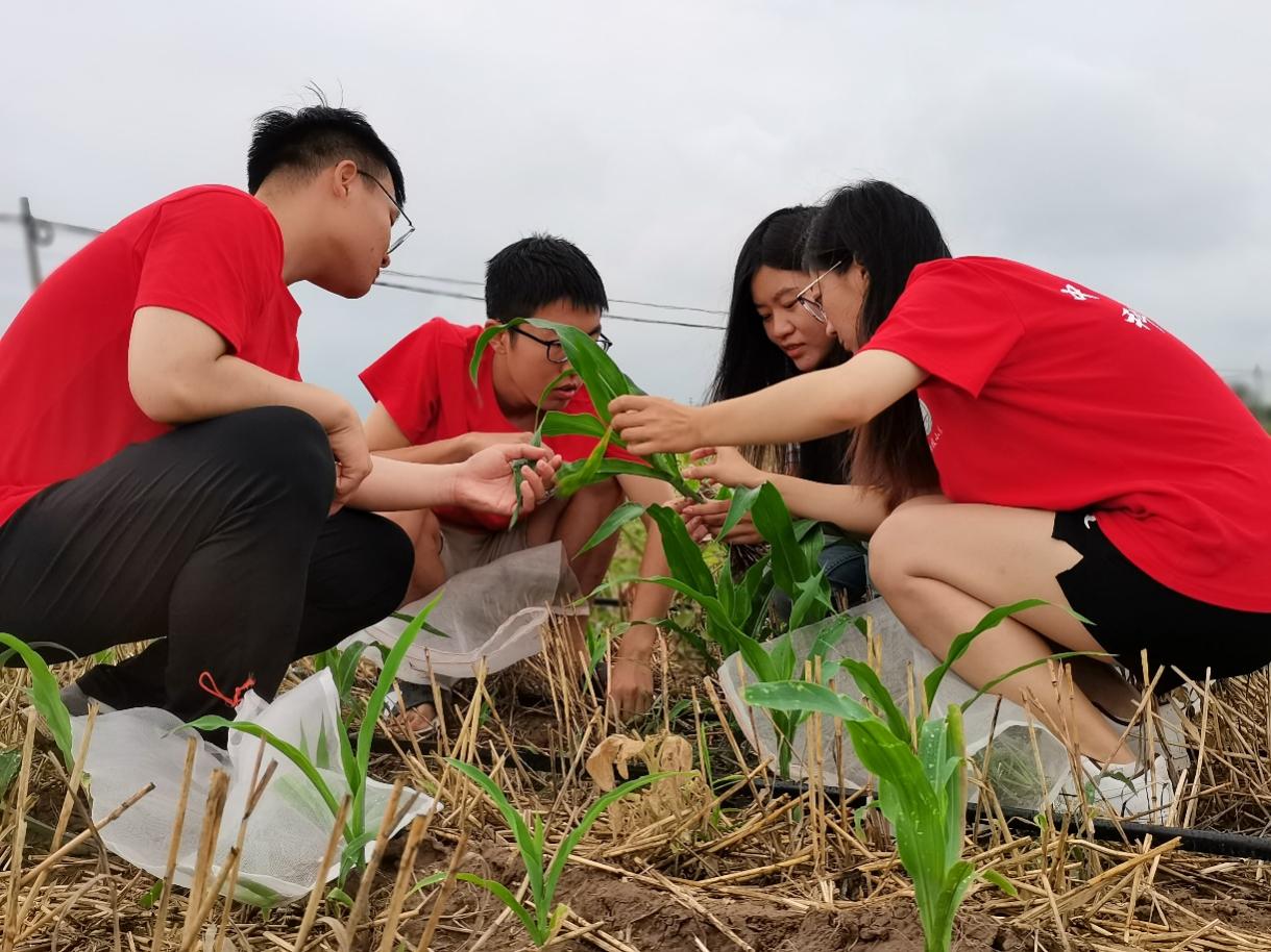 ▲曲周科技小院同学们在田间查看玉米苗长势。张晓宁摄