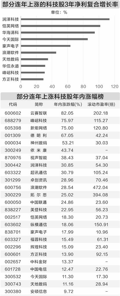 上榜的科技股整体成长性较好。数据显示,2021年至2023年,14只个股营收复合增长率超10%,16只个股净利复合增长率超20%。其中,润泽科技3年净利复合增长率接近114%居首;恺英网络复合增长率接近102%位居次席;此外华清海科、今天国际、豪声电子等个股3年净利复合增长率均超60%。