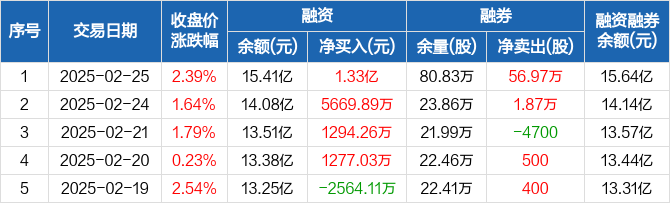 融资方面,当日融资买入3.54亿元,融资偿还2.21亿元,融资净买入1.33亿元,净买入额两市排名第九,连续4日净买入累计2.16亿元。融券方面,融券卖出57.34万股,融券偿还3700股,融券余量80.83万股,融券余额2251.11万元。融资融券余额合计15.64亿元。