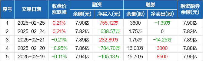 融资方面,当日融资买入2302.71万元,融资偿还1547.59万元,融资净买入755.12万元。融券方面,融券卖出0股,融券偿还1.39万股,融券余量3600股,融券余额3.38万元。融资融券余额合计7.9亿元。