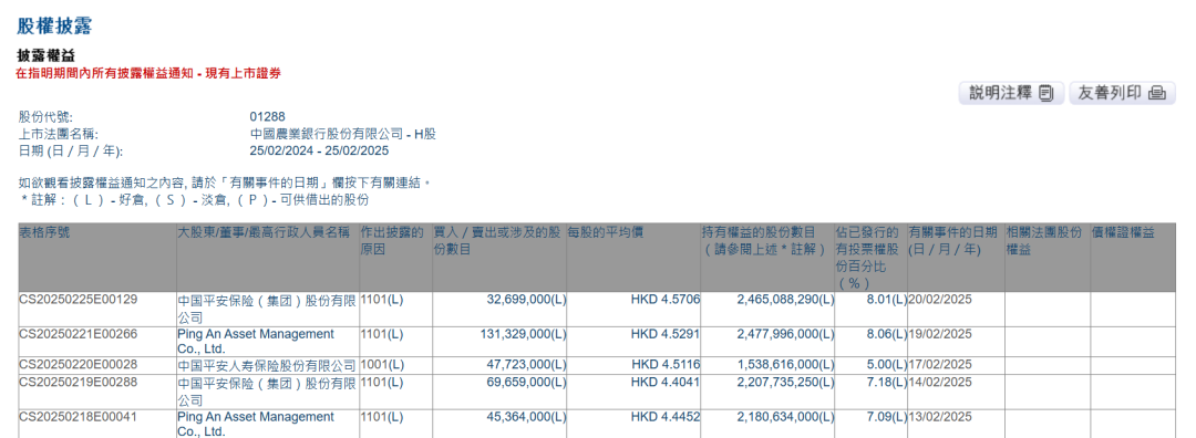 港交所股权披露数据显示,平安人寿在2月17日以每股4.5116港元的平均价,买入4772.3万股农业银行H股,买入金额合计约为2.15亿港元,交易后持股比例为5%,触发平安人寿举牌。