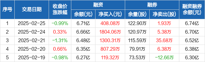 融资方面,当日融资买入1807.32万元,融资偿还1399.24万元,融资净买入408.08万元,连续5日净买入累计4439.07万元。融券方面,融券卖出3.81万股,融券偿还1.88万股,融券余量122.9万股,融券余额367.47万元。融资融券余额合计6.74亿元。