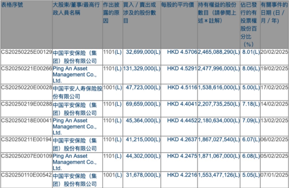 值得注意的是,2024年12月以来,平安集团于还大举买入建设银行H股、工商银行H股,目前持股占比分别突破5%、18%。其中,2月14日,平安集团买入1.33亿工商银行H股,每股5.6737港元,耗资约7.54亿元。