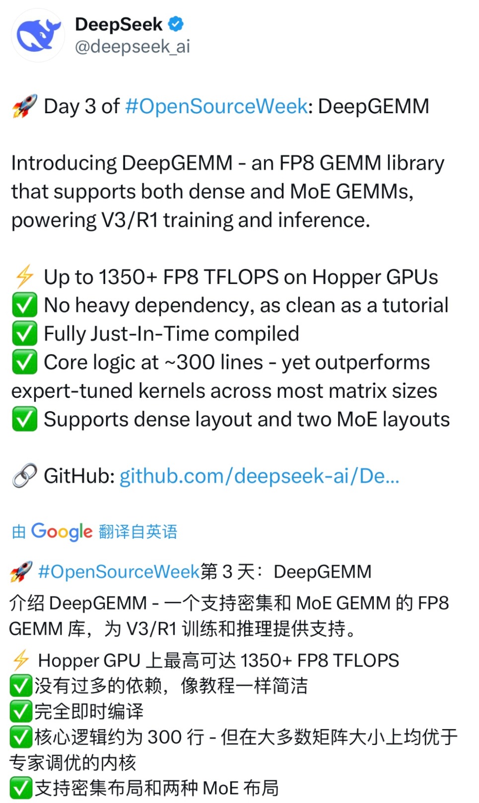 据DeepSeek方面介绍,DeepGEMM同时支持传统的稠密模型和MoE(混合专家)模型的GEMM运算,这一代码为基于英伟达Hopper架构(如H100 GPU)的V3/R1系列硬件提供高效的训练和推理支持。