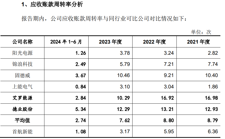 一般而言,客户集中度高,处于下游的供应商话语权会更低,这或许在一定程度上导致首航新能应收账款周转率低于同行可比公司平均水平。报告期,首航新能的应收账款周转率分别为6.36次、5.95次、3.17次和1.08次,可比公司的平均值分别为8.79次、8.8次、7.62次和2.74次,显然,公司应收账款周转率与同行平均值存在较大的差距。