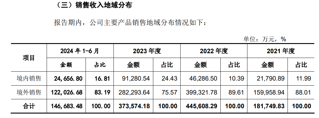 多年来,公司主营业务高度依赖境外市场,虽然公司也声称加大了国内市场的拓展力度,但事实上,首航新能除了2023年内销占比上升外,其余年份对境外销售占比非常稳定。报告期(2021-2023年及2024年上半年),公司境外市场营收分别为16亿元、39.93亿元、28.23亿元和12.2亿元,占营收之比分别为88.01%、89.61%、75.57%和83.19%。
