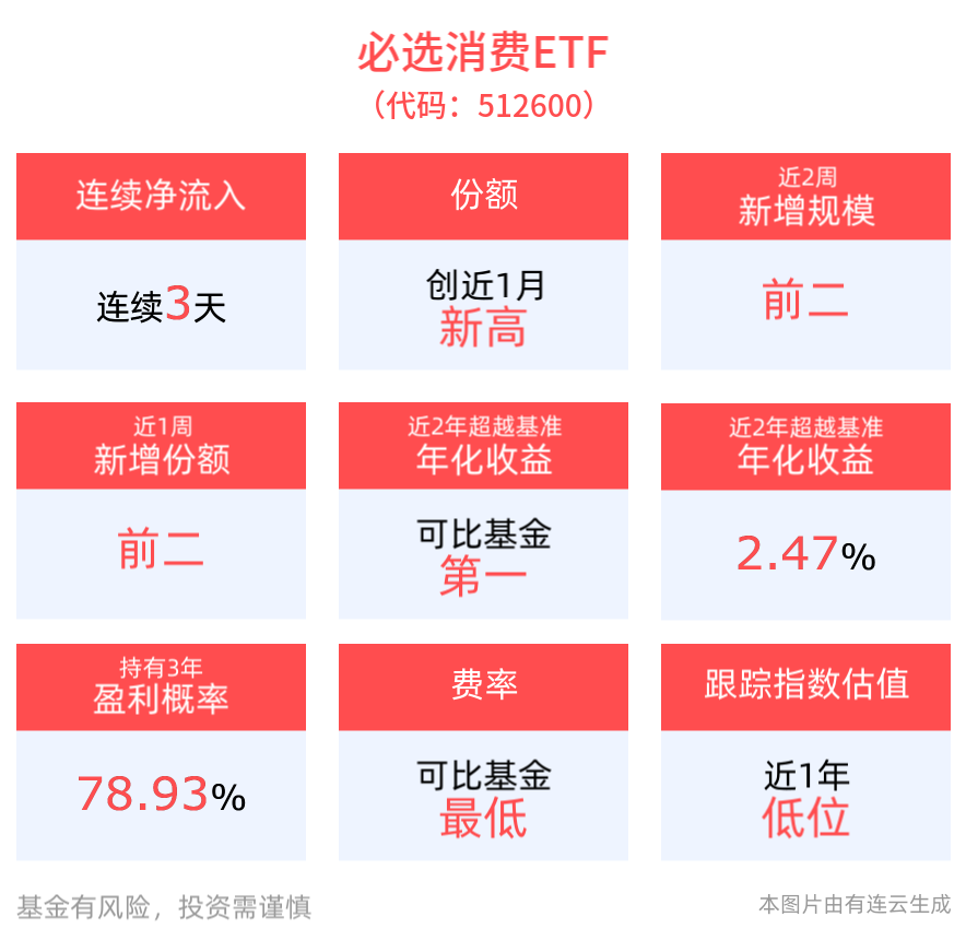 从资金净流入方面来看,必选消费ETF近3天获得连续资金净流入,最高单日获得603.40万元净流入,合计“吸金”777.64万元。