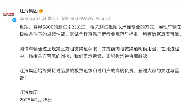 上述视频发布后,此事引起外界广泛关注。2月25日晚间,江汽集团在其官方微博发文回应,“测试车辆通过正规第三方租赁渠道获取,并提前向租赁渠道明确用途”。江汽集团方面表示,(尊界S800)相关测试视频以严谨专业的方式,展现车辆在极端条件下的卓越性能。测试全程遵循严苛行业规范与标准,所有数据真实可靠。