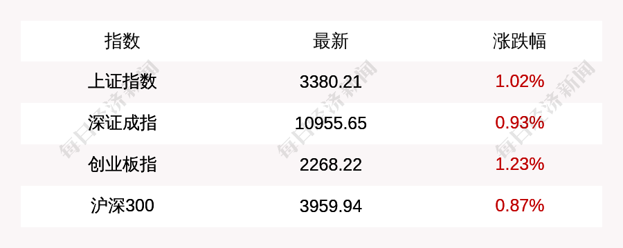每经AI快讯:北京时间2月26日15:00,上证指数收盘上涨34.17点,涨幅为1.02%,报收3380.21点,成交额7478.87亿元;深证成指收盘上涨101.15点,涨幅为0.93%,报收10955.65点,成交额11904.57亿元;创业板指收盘上涨27.63点,涨幅为1.23%,报收2268.22点,成交额5869.37亿元;沪深300收盘上涨34.29点,涨幅为0.87%,报收3959.94点,成交额3864.58亿元。