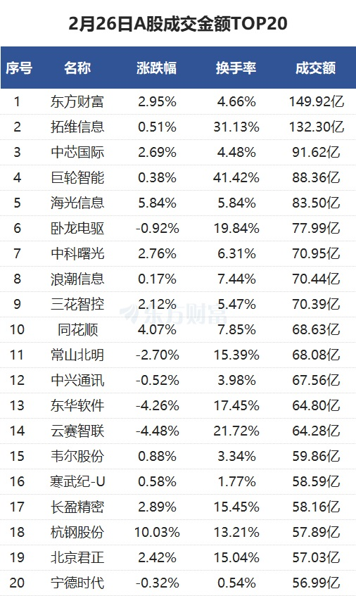 沪深两市成交额1.94万亿元,较上一交易日放量416亿元。个股方面,拓维信息当日成交132.3亿元。中芯国际当日成交91.62亿元。