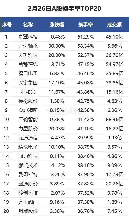 当天换手率最高的个股为卓翼科技,全天换手率61.29%。万达轴承紧随其后,全天换手率58.34%。
