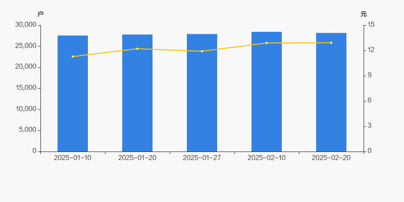 截至2025年2月20日,公司最新流通股本为2.65亿股。户均持有流通股数量由上期的9323股上升至9409股,户均流通市值12.16万元。