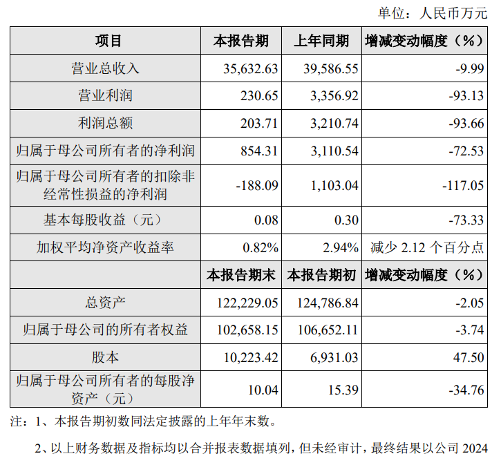 2月26日,永信至诚(688244)发布公告,2024年度业绩快报显示,公司营业总收入为3.56亿元,同比下降9.99%;营业利润为231万元,同比下降93.13%。归母净利润为854万元,同比下降72.53%。具体数据如下表: