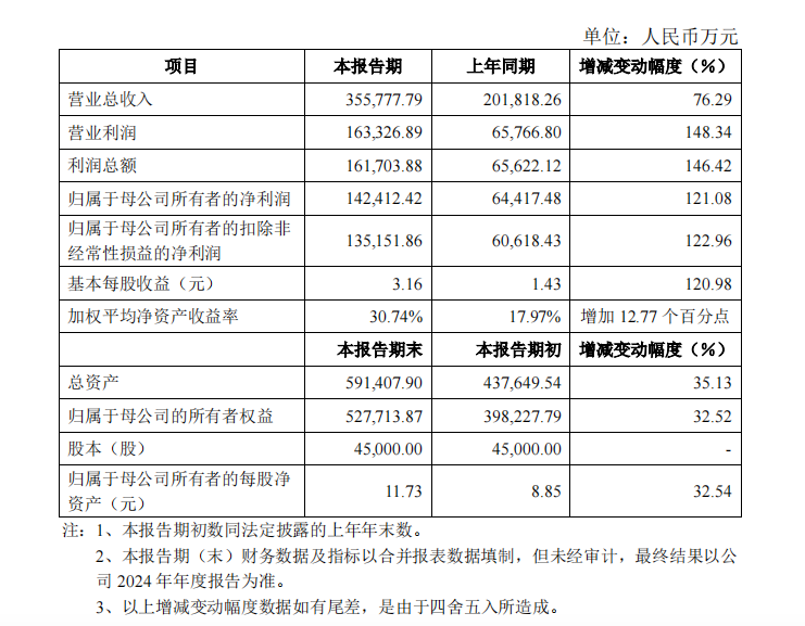 财务数据显示,公司通过降本增效措施显著提升盈利能力,2024年营业利润、利润总额分别同比增长148.34%、146.42%,总资产规模较期初增长35.13%至59.14亿元,归属于母公司的所有者权益达52.77亿元,增幅32.52%。不过,下半年单季度增速呈现放缓趋势,第三季度营收同比增速降至59.73%,较第一、二季度的168.65%、76.56%明显回落。