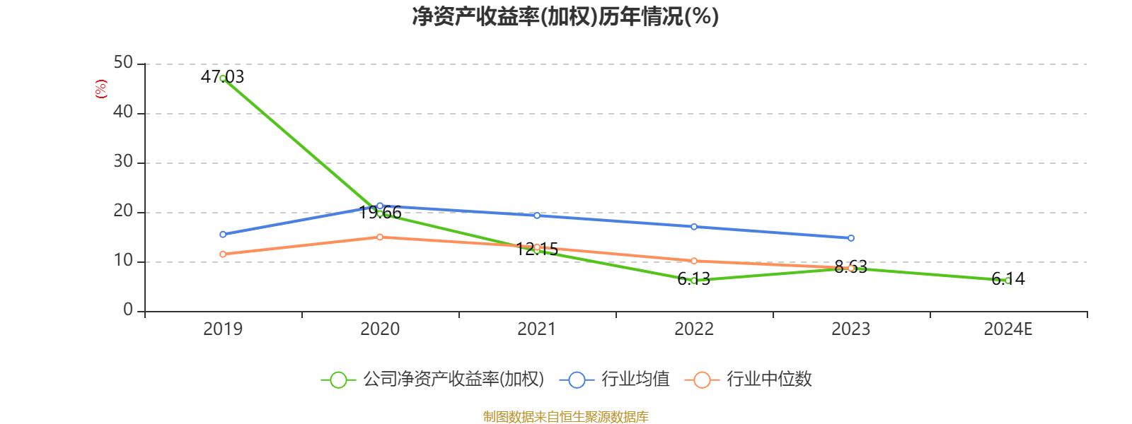 数据显示,2024年公司加权平均净资产收益率为6.14%,较上年同期下降2.49个百分点。