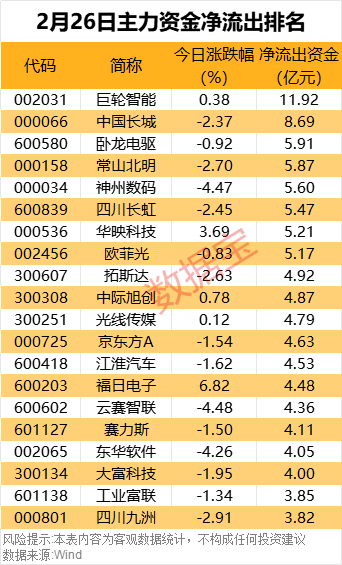 据数据宝统计,114股主力资金净流出额超1亿元。个股方面,巨轮智能、中国长城、卧龙电驱主力净卖出11.92亿元、8.69亿元、5.91亿元。