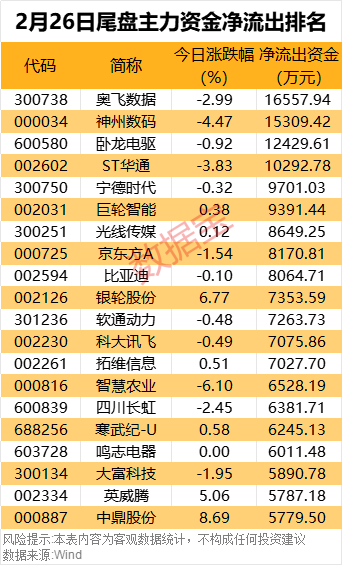 尾盘资金流出奥飞数据、神州数码、卧龙电驱、ST华通均超亿元,其中奥飞数据尾盘流出最多,达1.66亿元。