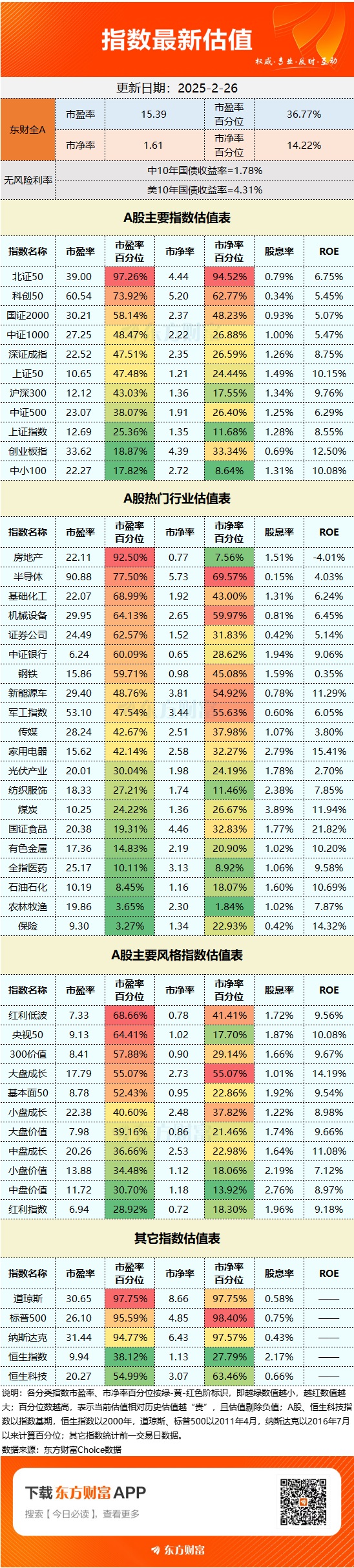 截至2月26日收盘,东方财富Choice数据显示,东财全A市盈率为15.39倍,市盈率百分位为36.77%;市净率为1.61倍,市净率百分位14.22%。