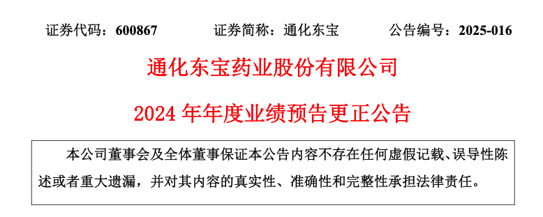 2月26日晚间, 国内胰岛素龙头企业通化东宝 (600867)发布2024年年度业绩预告更正公告显示,经财务部门再次测算,预计2024年年度实现归属净利润 约为1164.21万元,同比减少约99%;预计扣非净利润约为2.64亿元,同比减少约77.43%。
