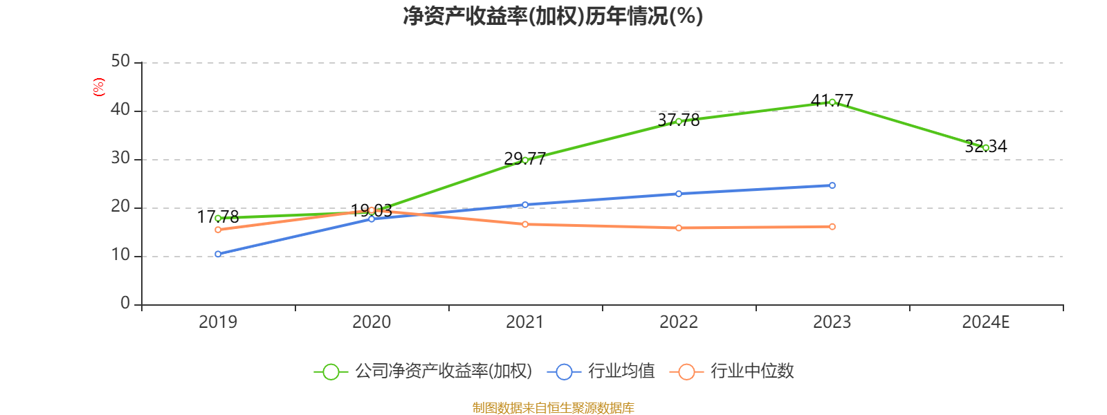 数据显示,2024年公司加权平均净资产收益率为32.34%,较上年同期下降9.43个百分点。