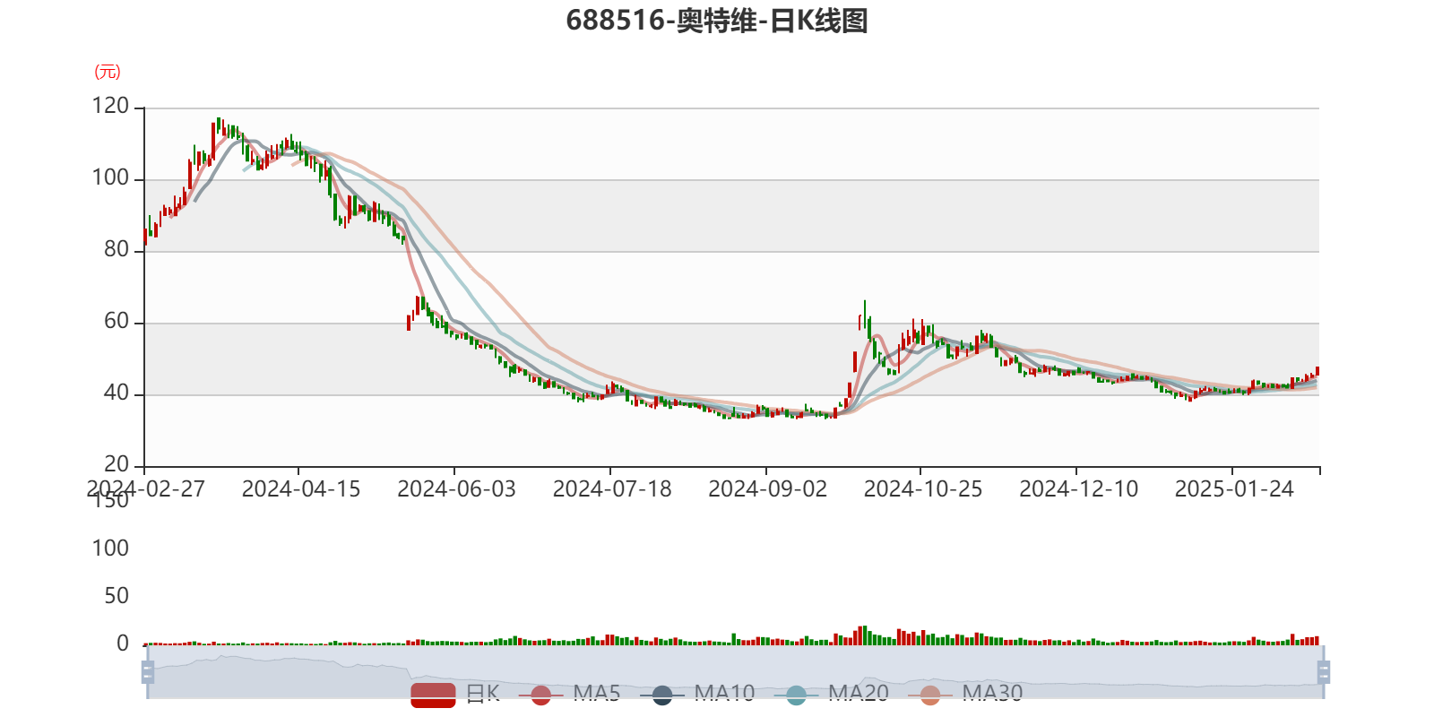 中证智能财讯奥特维(688516)2月26日晚间披露2024年业绩快报,公司实现营业收入89.46亿元,同比增长41.96%;归母净利润13.14亿元,同比增长4.64%;扣非净利润12.81亿元,同比增长9.79%;基本每股收益4.18元,加权平均净资产收益率为32.34%。以2月26日收盘价计算,奥特维目前市盈率(TTM)约为11.39倍,市净率(LF)约3.65倍,市销率(TTM)约1.67倍。