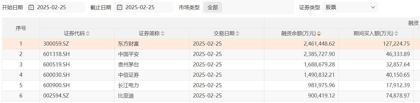 融资余额方面,东方财富、中国平安、贵州茅台、中信证券排在前四,均超过百亿元。其中,东方财富以246.14亿元居首,中国平安以238.57亿元紧随其后。