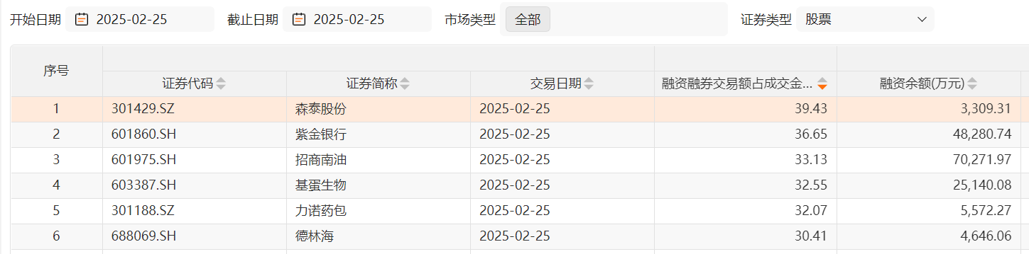 此外,值得一提的是,2月25日部分个股融资融券交易额占成交金额比例较高。森泰股份、紫金银行、招商南油、基蛋生物、力诺药包、德林海的融资融券交易额占成交金额比例均超过30%。