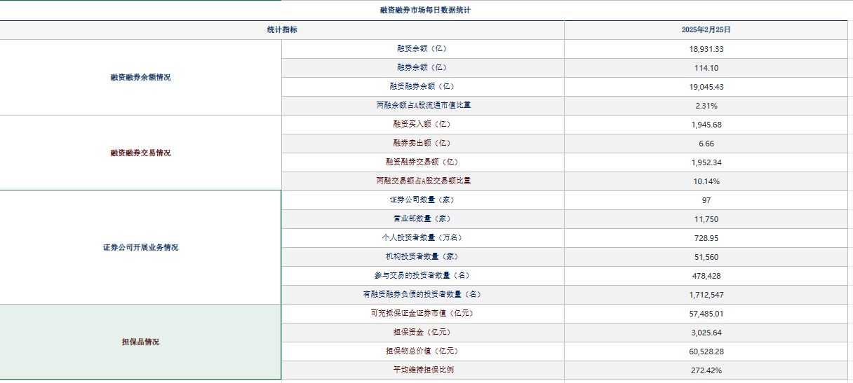 截至发稿,中证数据披露了2月24日、2月25日的融资融券数据。下图为2月25日的数据情况,一共披露“融资融券余额情况、融资融券交易情况、证券公司开展业务情况以及担保品情况”四大类数据,包括18项具体指标。