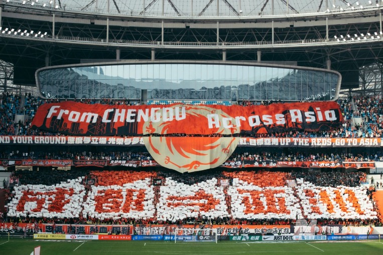 成都“蓉城”主场,球迷拼出巨幅TIFO 图片来源:每经记者张建摄