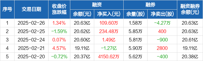 融资方面,当日融资买入1.82亿元,融资偿还1.81亿元,融资净买入109.6万元,连续3日净买入累计1.53亿元。融券方面,融券卖出100股,融券偿还4.28万股,融券余量1.58万股,融券余额22.75万元。融资融券余额合计20.63亿元。