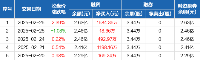 融资方面,当日融资买入4710.05万元,融资偿还3025.69万元,融资净买入1684.36万元,连续6日净买入累计4001.6万元。融券方面,融券卖出0股,融券偿还0股,融券余量3.44万股,融券余额32.4万元。融资融券余额合计2.63亿元。